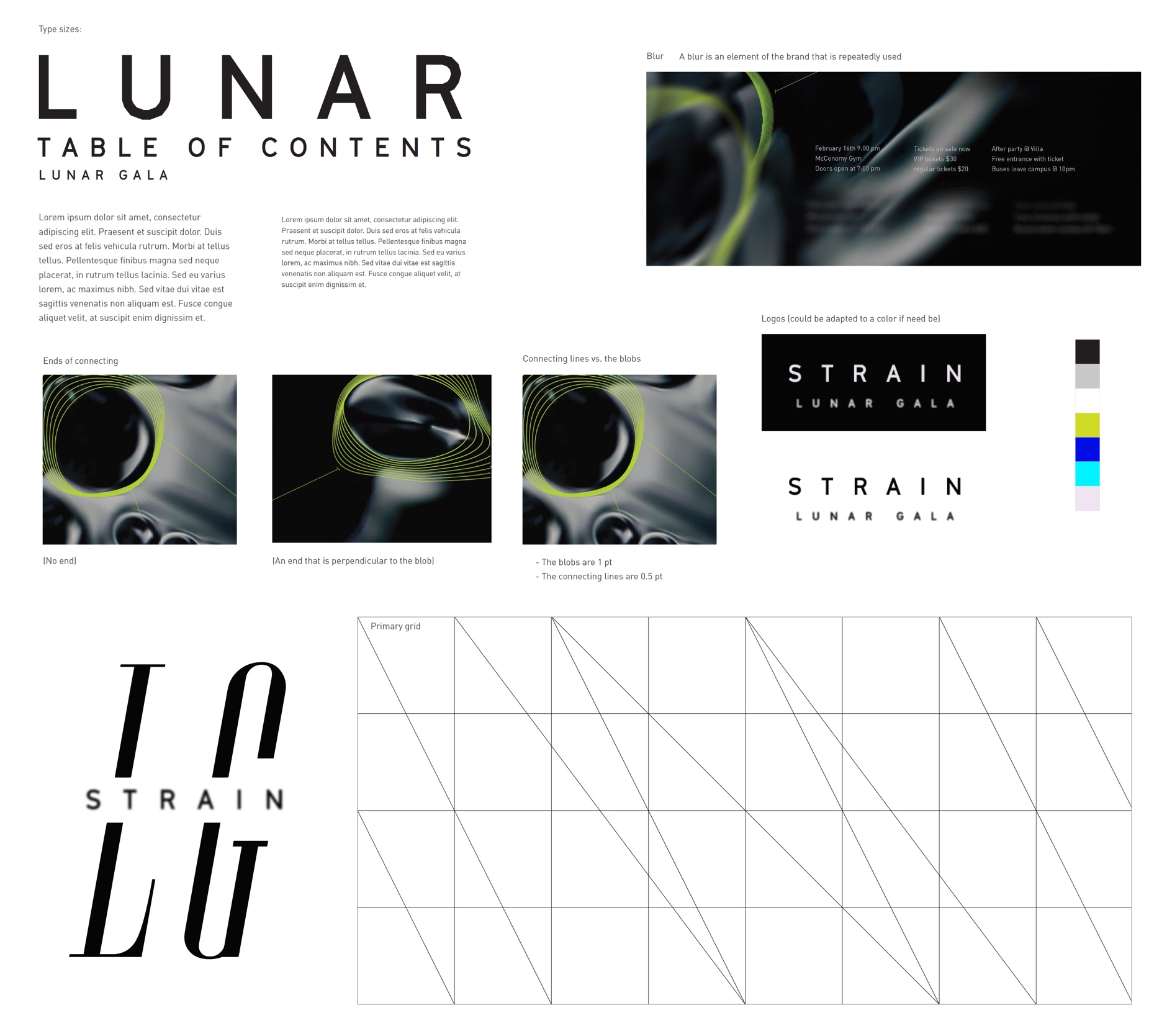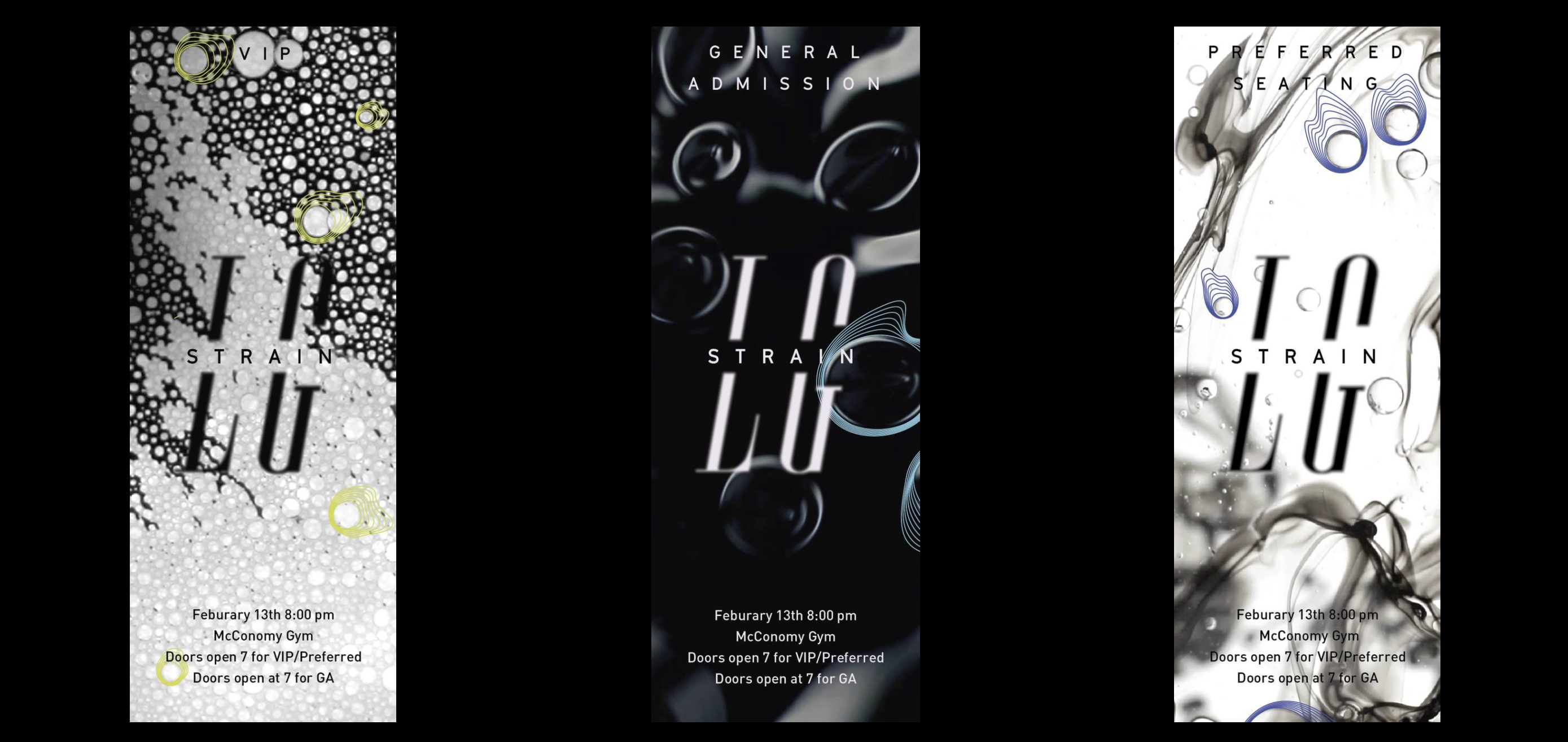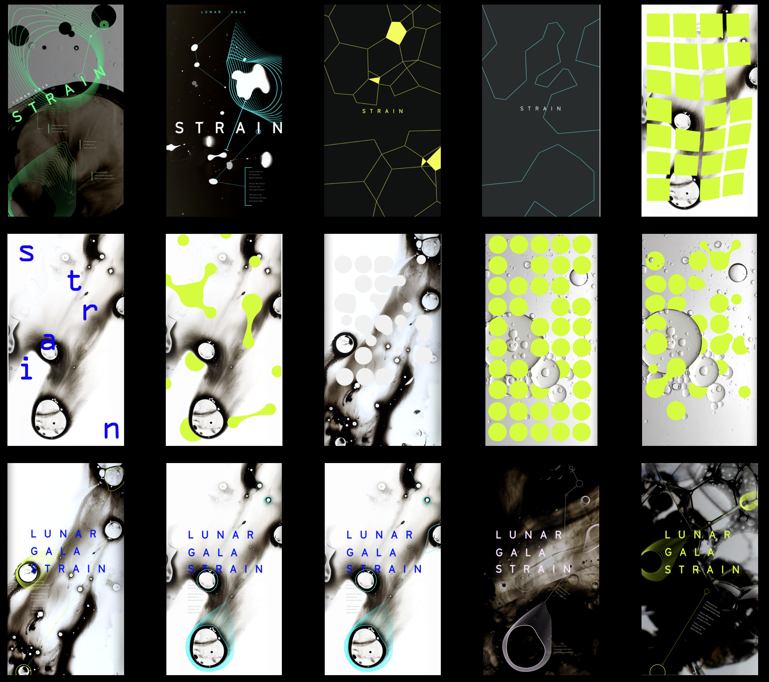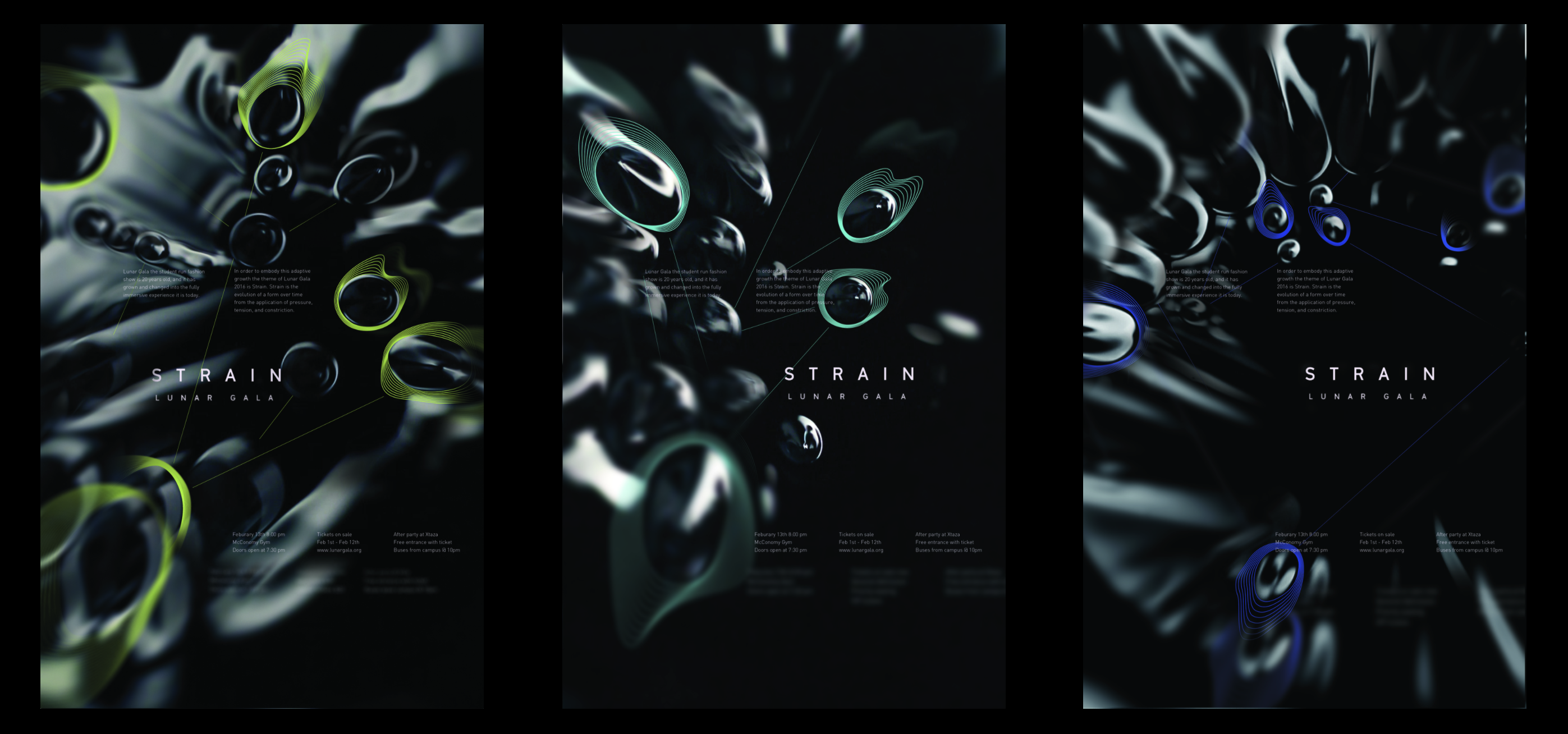After months of iteration, we decided on several visual elements to follow, such as blurs, connected lines, and outlines. We created the logo for Lunar Gala: Strain, and chose outlined graphics of the images connected by lines. For incorporation with the generic branding, we used the blur to give the audience a feeling of straining to read content.
