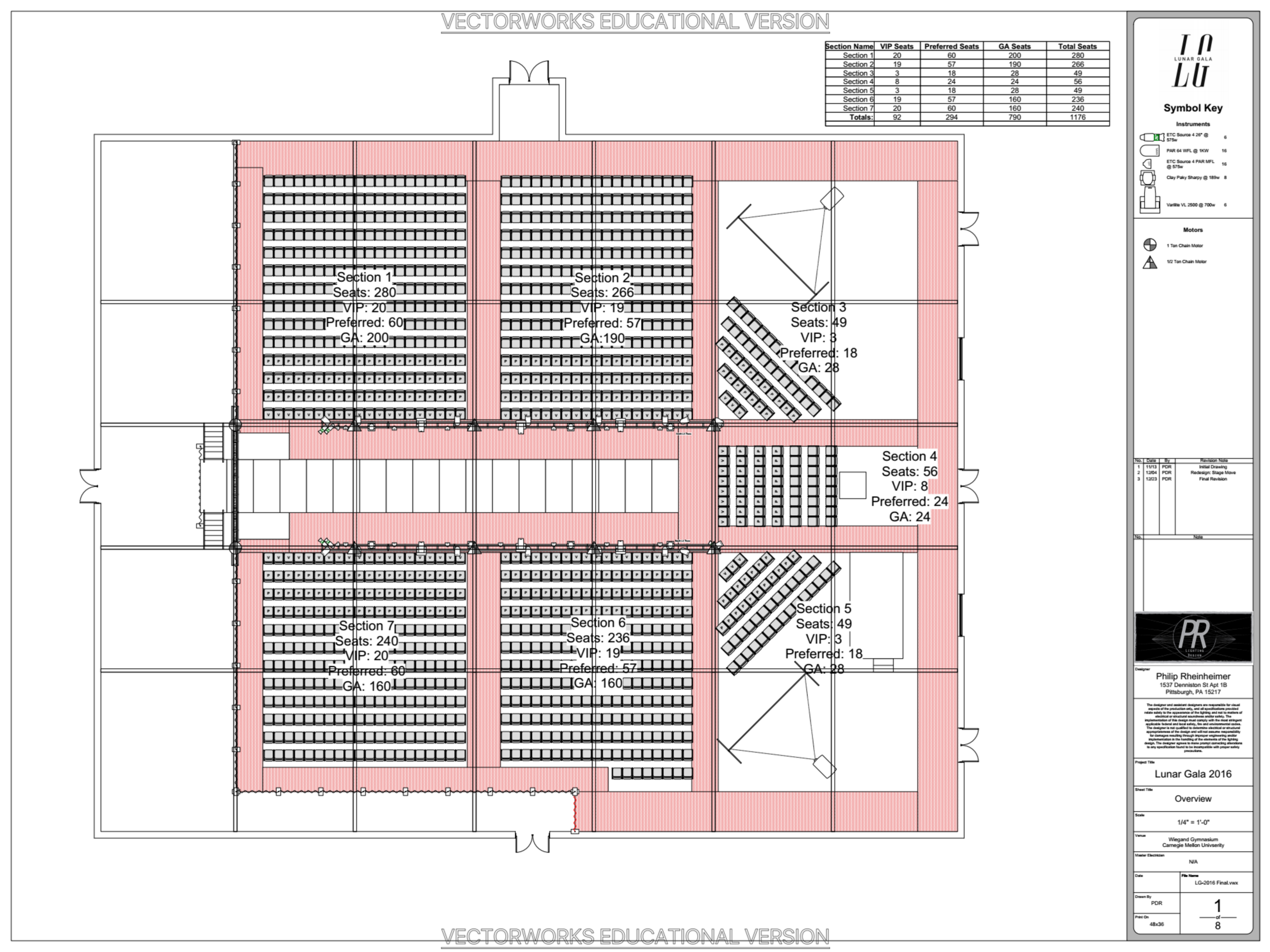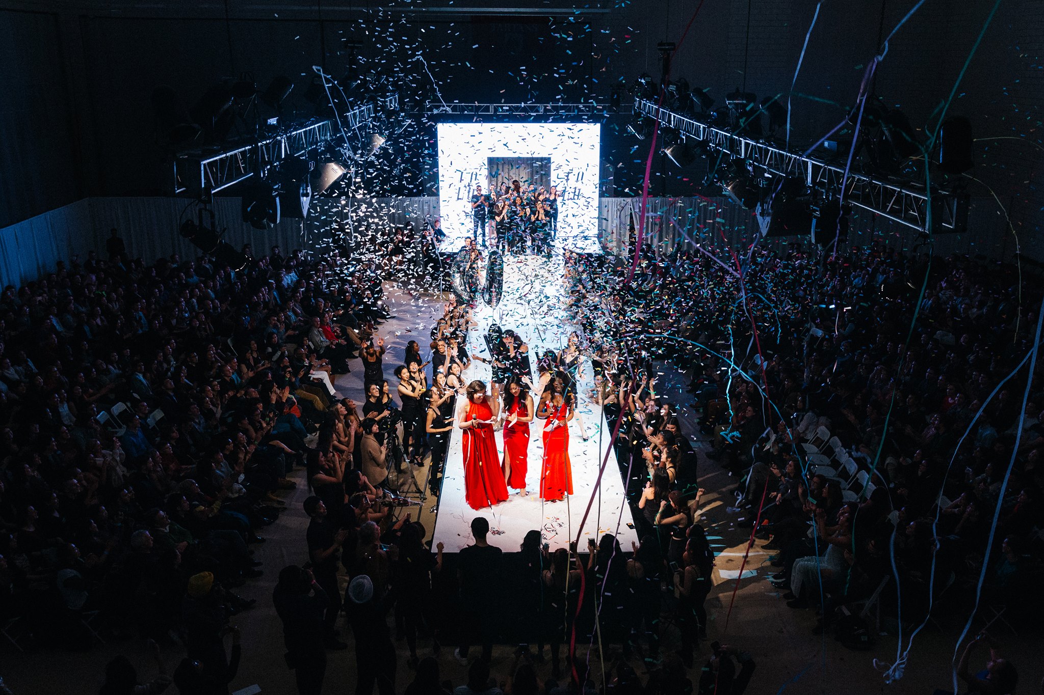 To focus on the content of the show, we created a simple t shaped stage with an LED wall backdrop. The LED wall enabled quality video behind the runway. We chose to follow fashion shows that we found successful and found that we were drawn to those with clean, white backdrops, drawing even more attention to the content produced by the designers of the show. As a result, we chose to envelope the Weigand gym, surrounding as much as we could in order to take away from the idea of being in a gym. Along those lines, we wanted to immerse the audience, removing any sense of the feeling of being in the gym. By keeping lighting minimal in the audience and using like primarily only through the screens and white lights on the stage, we were able to draw all focus to the stage.